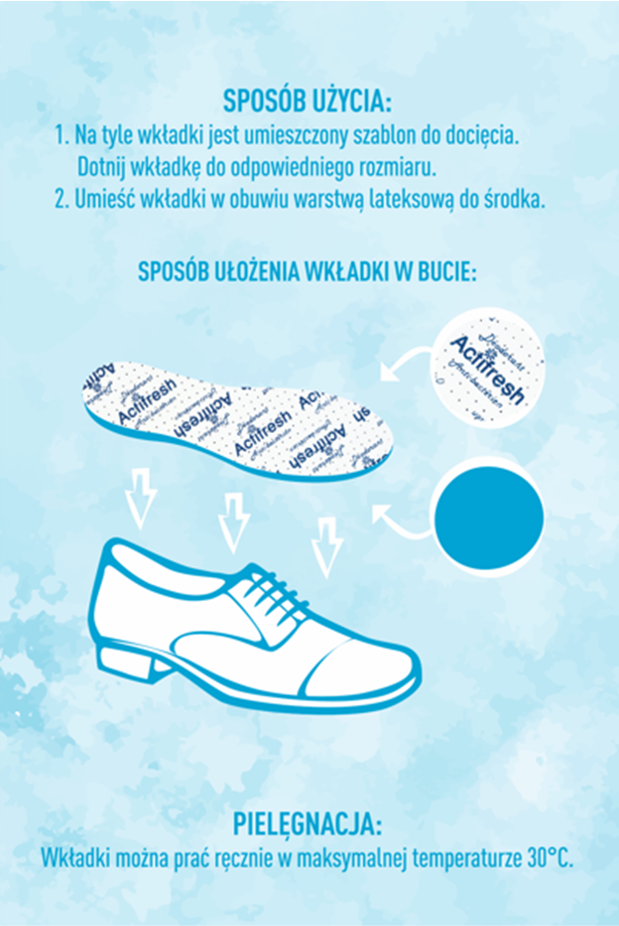 Die Einlage Actifresh der schweizerischen Firma Sanitized ist aus Material hergestellt, welches bakterientötend wirkt, es schützt die Fü?e vor Schimmel, Algen sowie Bakterien. Die Einlage wird entlang der Grö?enmarkierung ausgeschnitten. Sie ist einsetzbar bei vielen Halbschuhen, Stiefeletten sowie bei den folgenden Modellen unseres Geschäfts.