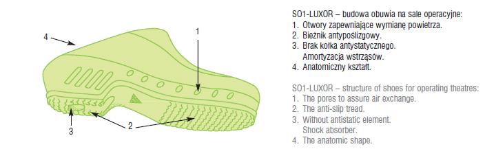 SO1 Luxor sind Spezialschuhe, bestimmt für den Einsatz in Operationssälen und Eingriffsräumen. Durch ihre besonderen Eigenschaften erfüllen sie auch die höchsten Sicherheitsstandards in OP-Sälen. Sie können in Autoklaven sterilisiert und in Waschmaschinen gewaschen werden.