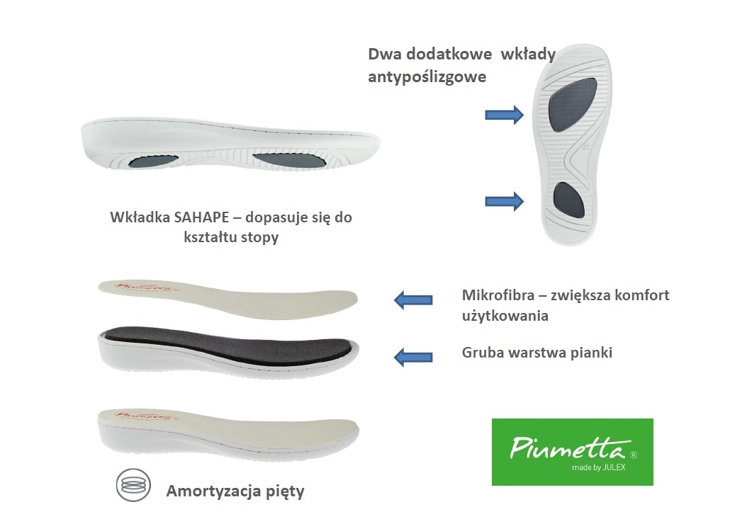 Piumetta ist eine Kollektion von komfortablen Damenschuhen für die Arbeit und für täglichen Gebrauch. Die Modelle in dieser Serie sorgen für Tragekomfort und haben eine ästhetische Optik. Leichte anatomische Sohlen sind auf höchsten Komfort zugeschnitten. Bei allen Modellen wird Naturleder verwendet. Piumetta ist für Personen gedacht, deren Beine alltäglich hohen Belastungen ausgesetzt sind.